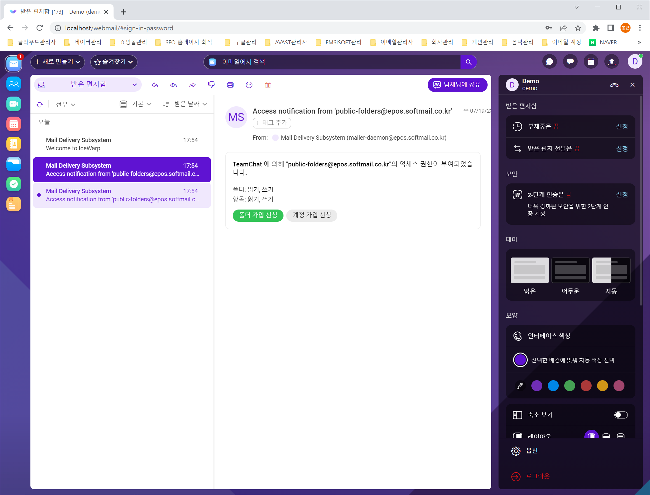 아이스워프 메일서버 설치 테스트 또는 메일호스팅 데모를 원하시면 언제든지 연락주세요.