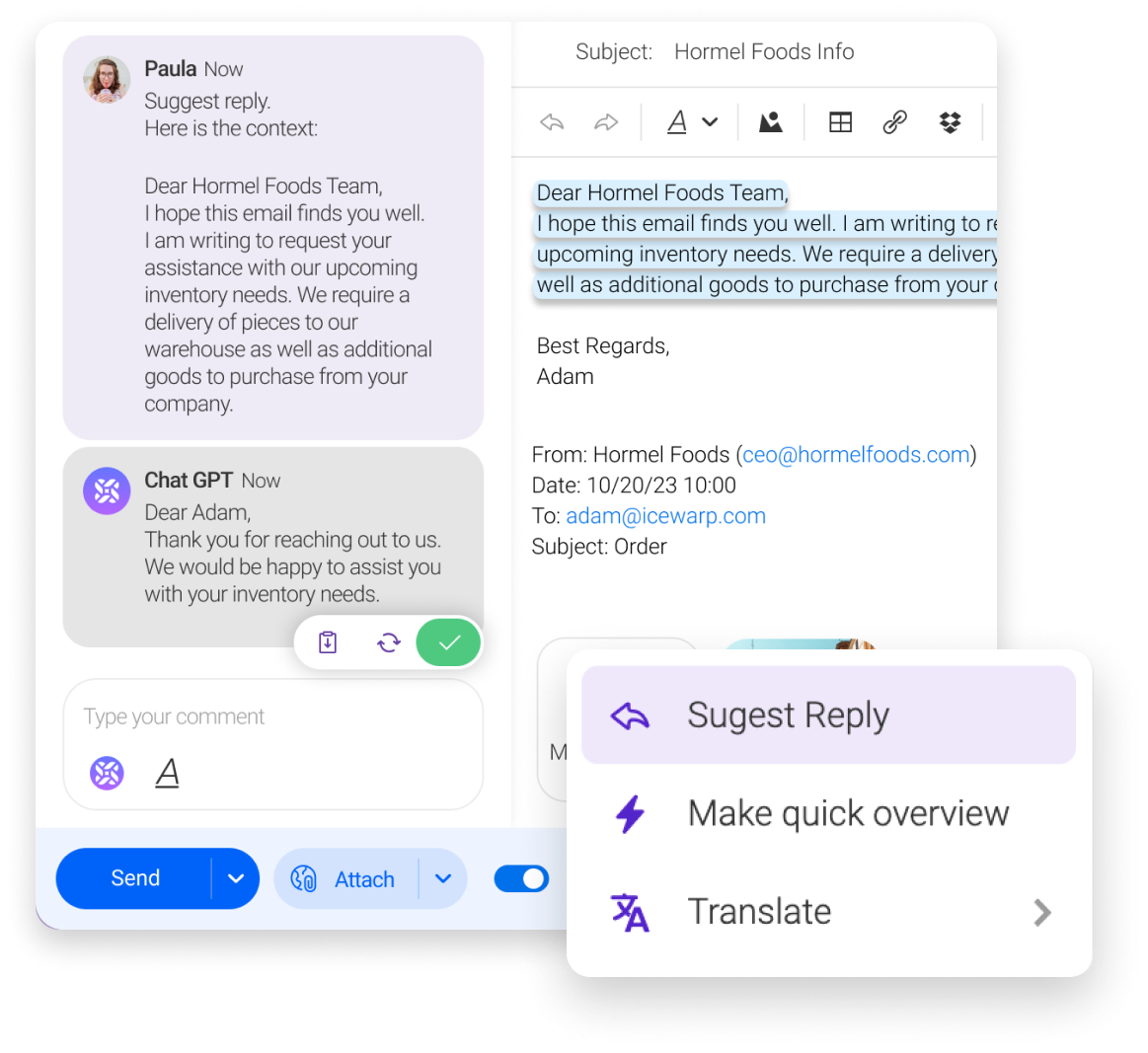 IceWarp 메일서비스, ChatGPT 통합으로 이메일에서 활용, AI추천, 번역 등