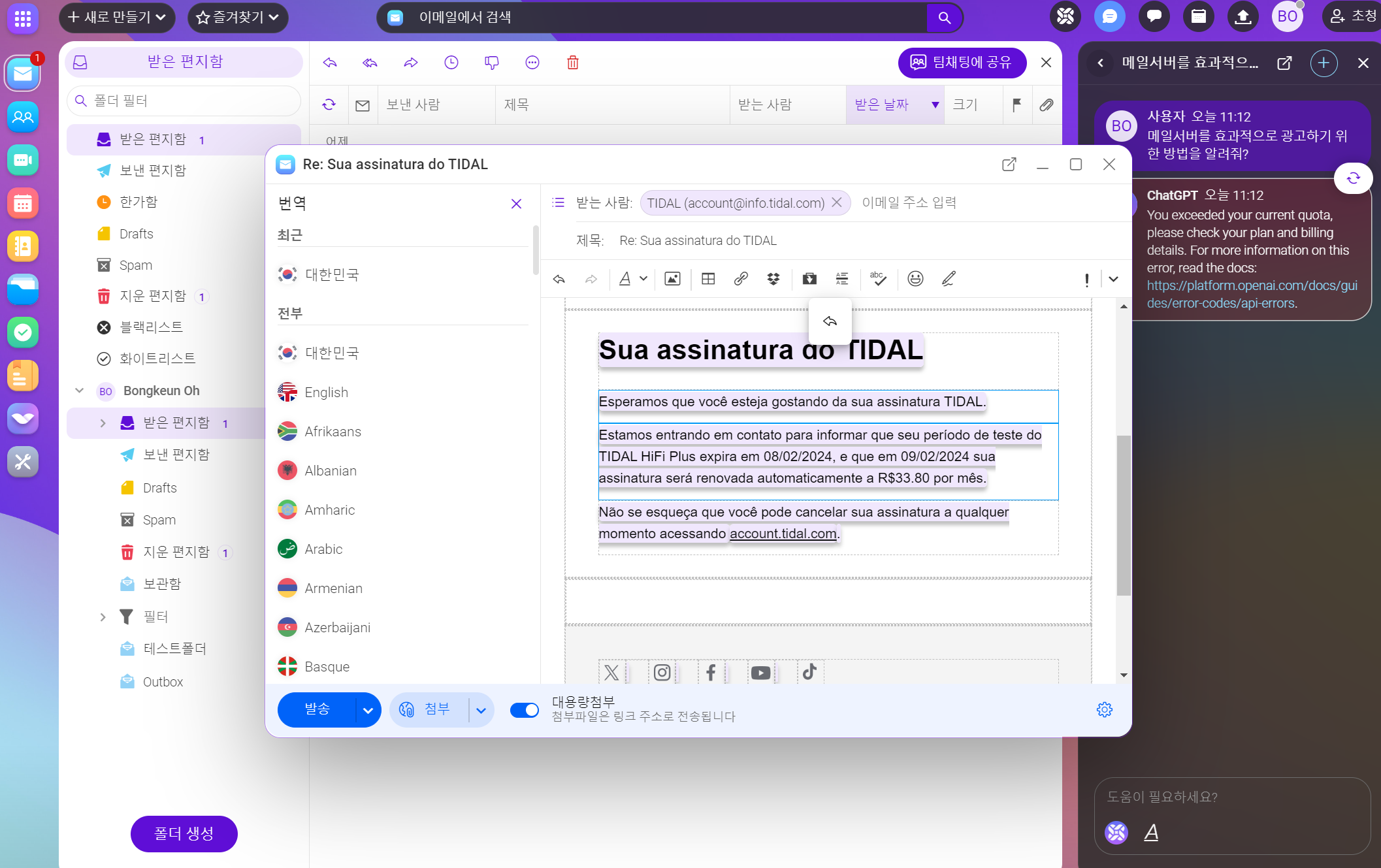 이와 같이 ChatGPT 비밀키를 등록하면 웹메일 상에서 앞에서 설명한 것처럼 ChatGPT와 통합하여 AI의 조력을 받을 수 있습니다. 웹메일 우측 패널에 GPT와의 대화를 진행할 수 있으며, 메일작성시 번역이나 대답 메일 작성시 문구추천 등의 도움을 받을 수 있습니다.