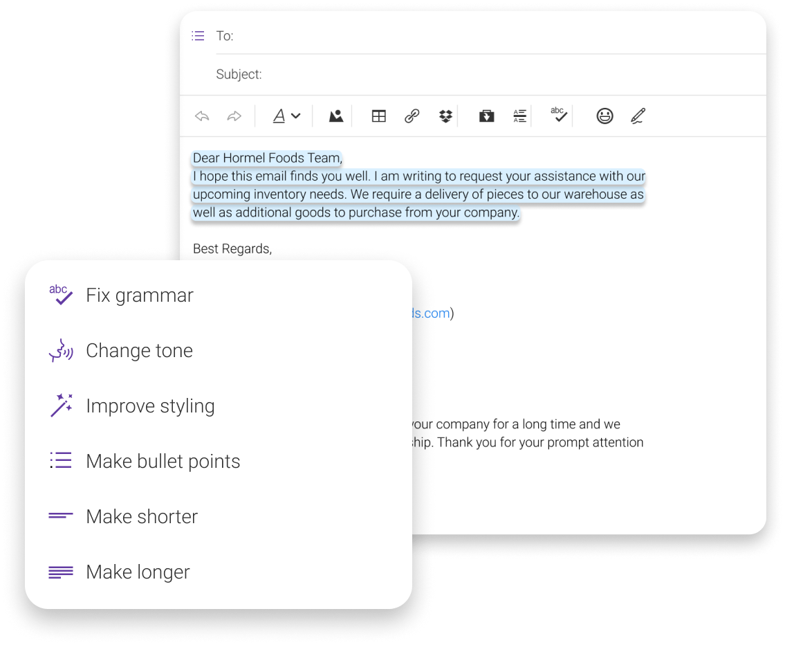 이메일, TeamChat 게시물 및 채팅을 통해 생각을 간결하게 전달할 수 있도록 내장된 ChatGPT 단축키를 사용하면 어조를 변경하고, 스타일을 개선하고, 글을 더 짧게 또는 길게 만들고, 글머리 기호로 나눌 수도 있습니다.